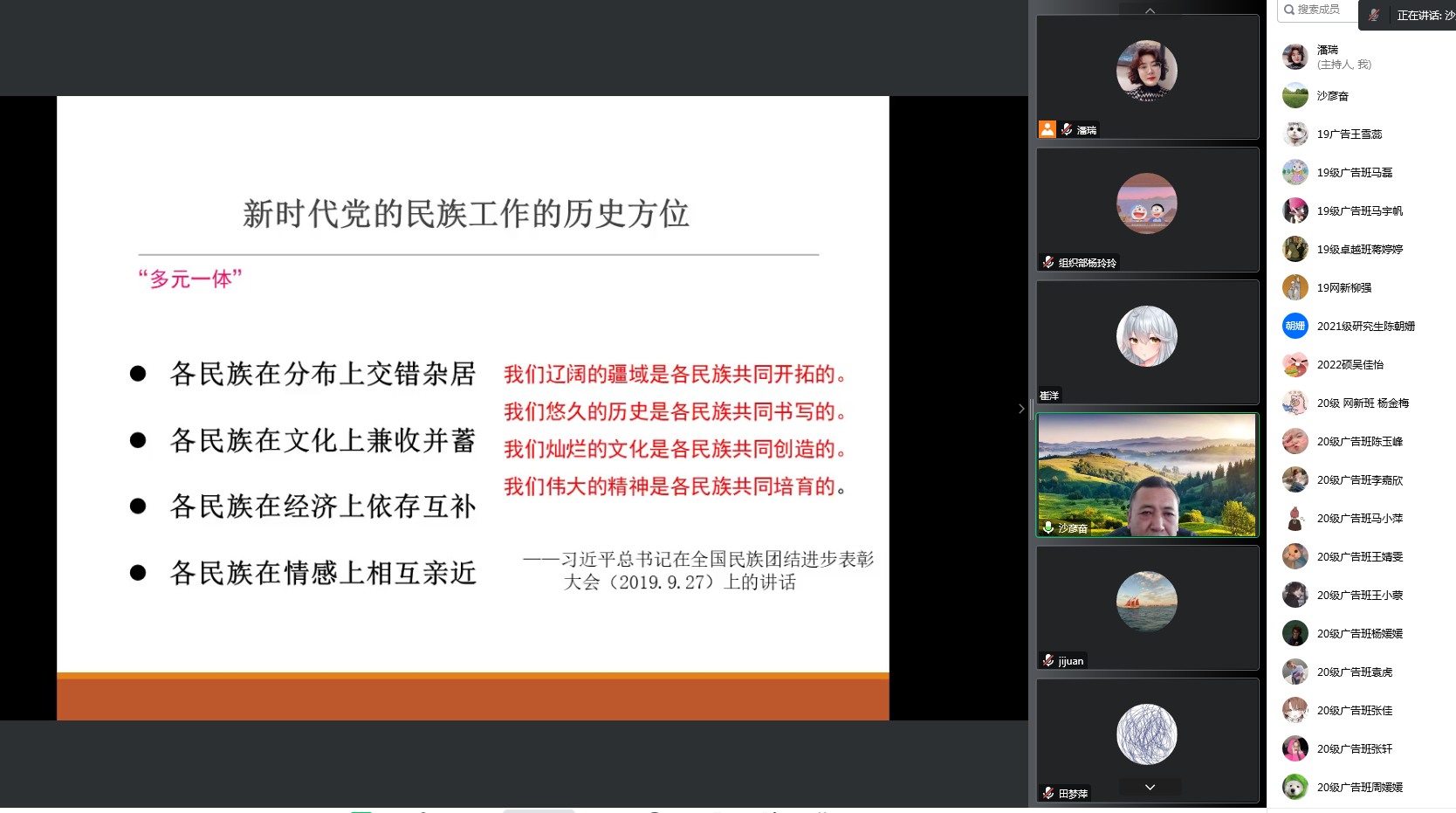 开展了主题为“把握历史方位,铸牢中华民族共同体意识”的线上党课培训。讲座由回族研究院副教授沙彦奋主讲,学院党总支书记潘瑞主持,全体教职工、学生党员、业余党校及团学骨干培训班全体学员聆听了讲座。