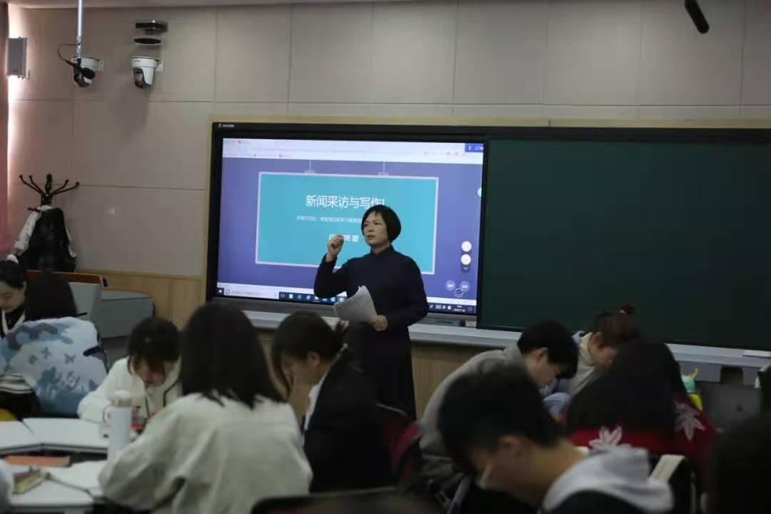 此次观摩课活动中,屠凤娥老师运用扎实新闻采访写作的功底和丰富的教学经验,借助线上线下相结合的授课方式,组织同学们进行对话练习和“新闻采写的基本方法——提问、倾听”练习。在“提问、倾听”练习中,屠老师播放了“王志采访钟南山院士”的视频,在观看过程中提醒大家注意倾听,学习记者王志在倾听中发现新线索并及时追问的专业技能,鼓励同学们找出王志采访过程中的优秀提问,运用所学知识进行分析。同学们热烈讨论,积极回答问题。课堂秩序良好,学习氛围浓厚。