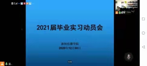 召开了2021届毕业实习动员线上会议。执行院长李世举、副院长顾广欣、新闻系主任于鹏亮、学生辅导员雷丽霞出席会议,2017级全体毕业生参加。
