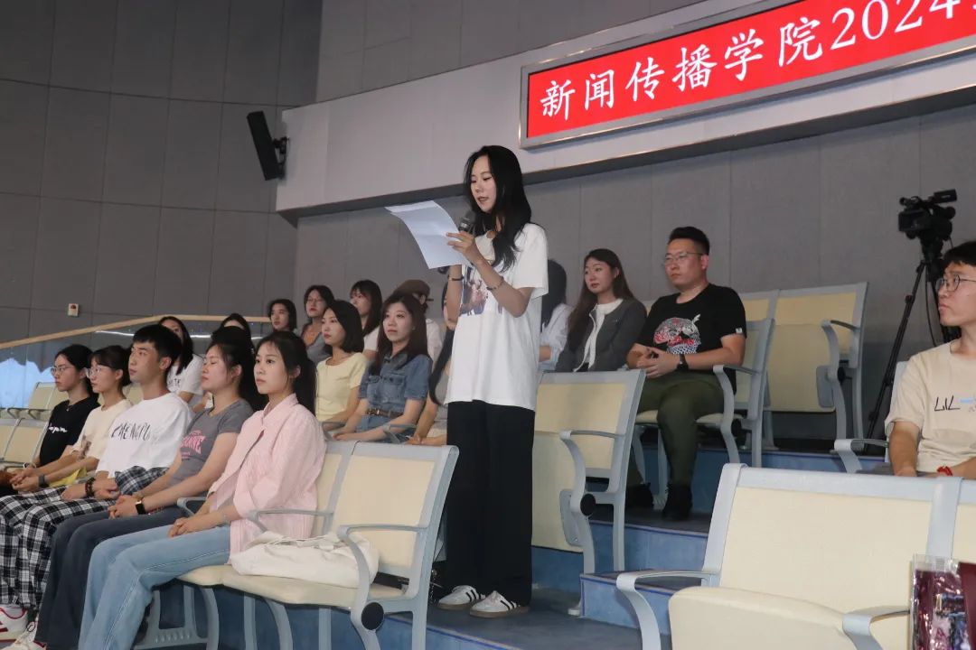 新生代表李姝昕同学的发言同样令人印象深刻。她用坚定的语气表达了对未来的展望与决心,承诺将会积极面对更加复杂的学术挑战,为新闻传播事业贡献自己的力量。最后,她以:“新闻之光,照亮未来;传播之力,塑造世界”结束了自己的发言。