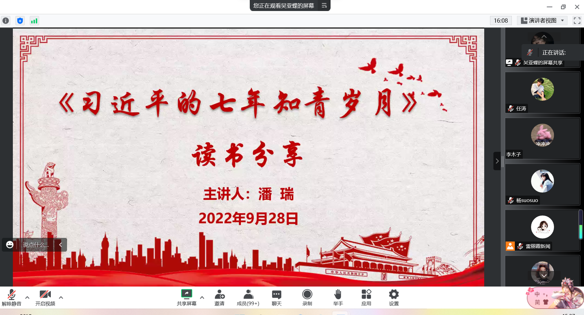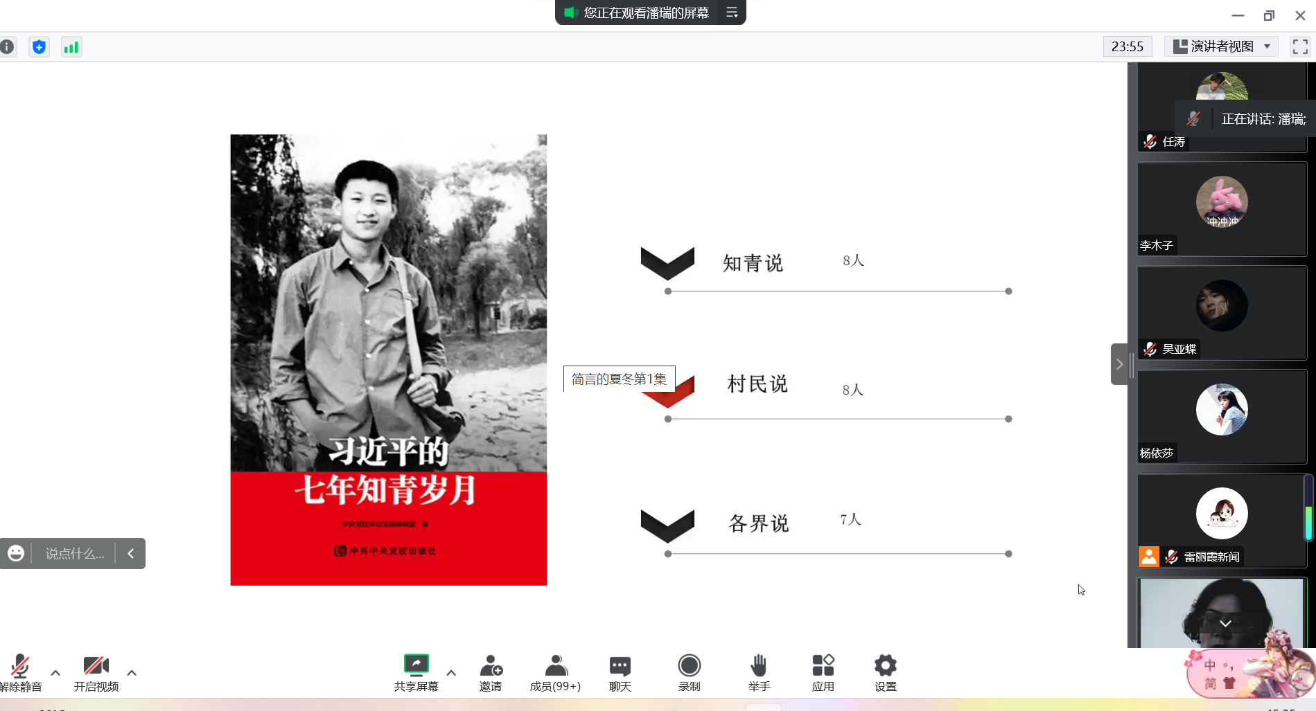 潘瑞向大家分享了《习近平的七年知青岁月》读书体会,通过视频播放、内容讲解,带领大家来到书中陕北的偏远小山沟,生动再现了青年习近平在梁家河七年的艰苦生活和成长历程。