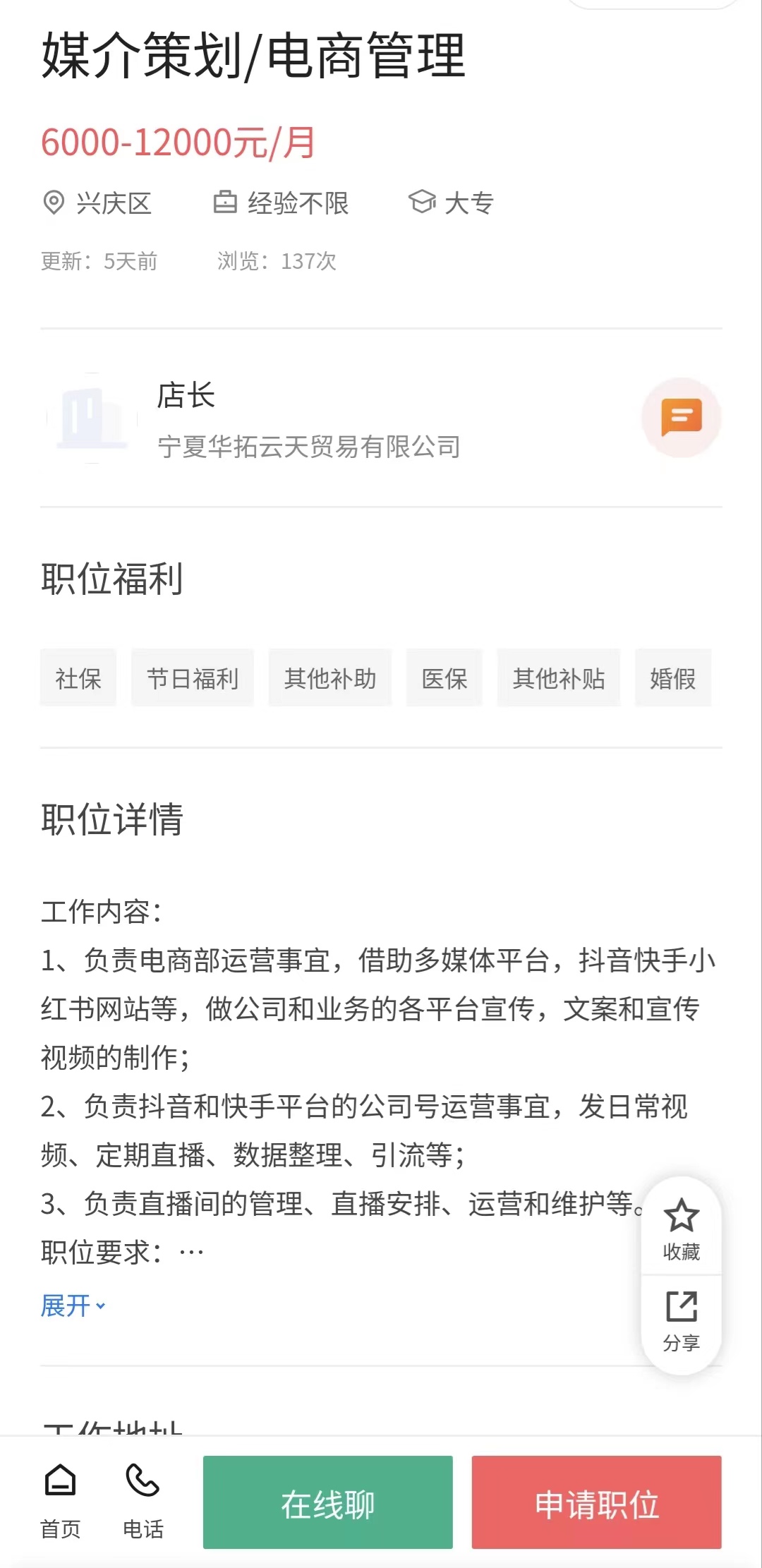 岗位:媒介策划/电商管理