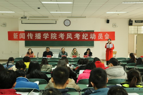 会上,教学科研办公室暴卿老师宣读了考试条例,明确考试流程及考试纪律,号召同学们端正考试态度,树立诚信考试意识。随后,2013级新闻学武文琪同学代表全院学生做出文明诚信考试的承诺。宫京成再次强调考试作弊的严重后果,表明了学院对作弊零容忍的态度,对同学们提出了明确的考试要求。周强书记对学生现存的考风问题做出深刻的剖析,同时也类举了一些考生因考试作弊受到严重处分的案例,让大家引以为戒,希望同学们能够自觉对待考试,最后提醒大家重视期末的安全问题,特别强调校园严禁大功率电器的使用。