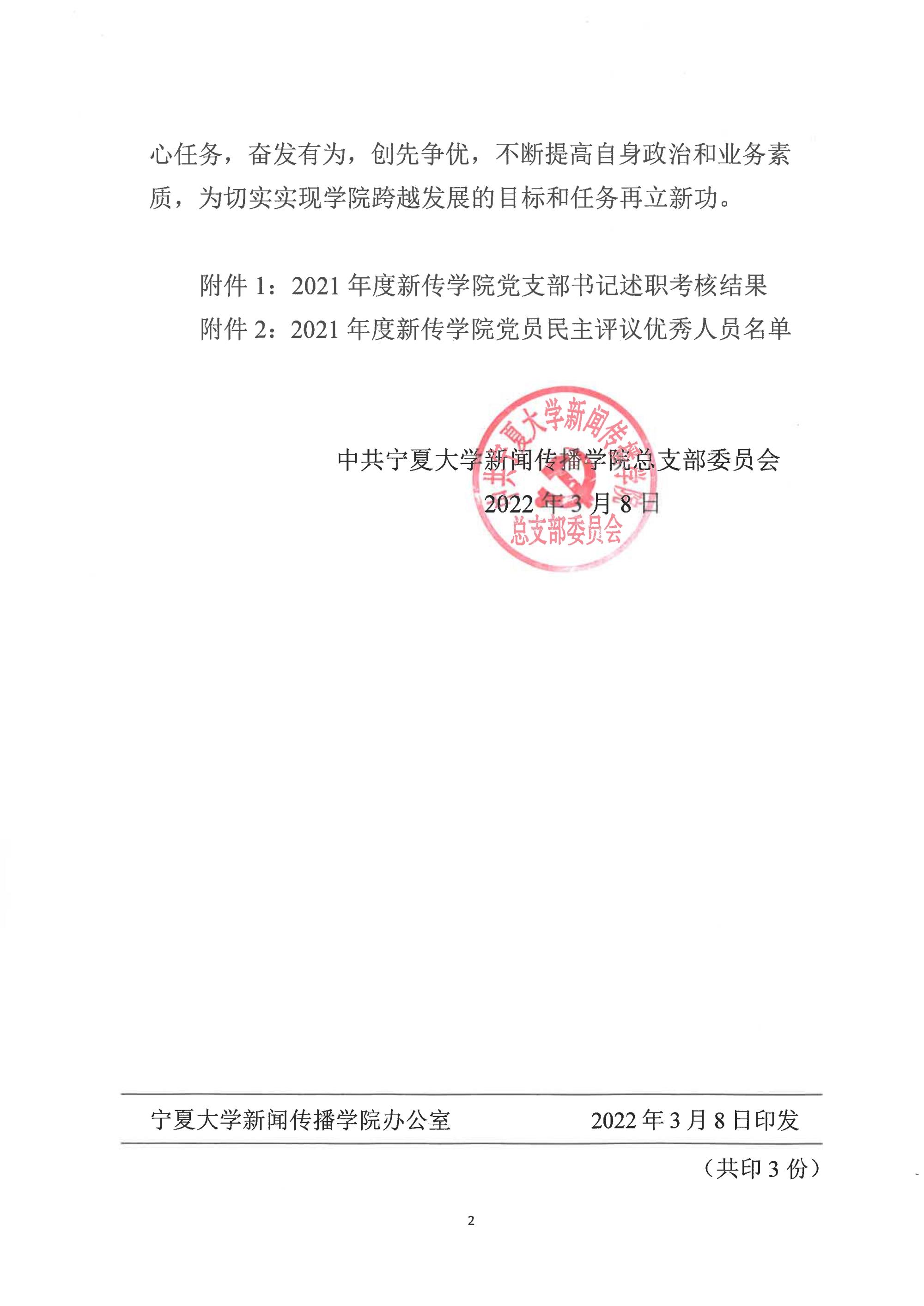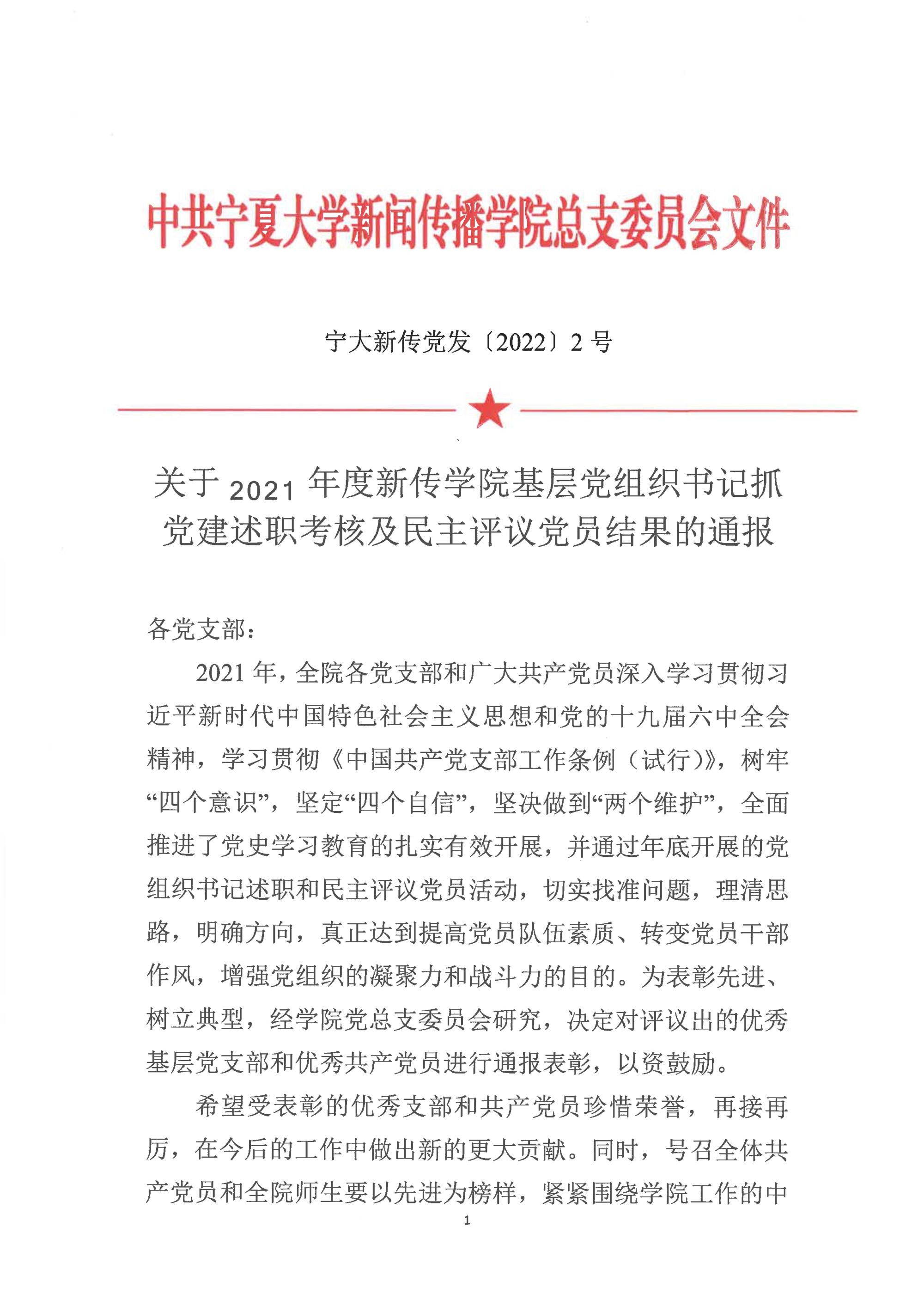 宁大新传党发〔2022〕2号 关于2021年度新传学院基层党组织书记抓党建述职考核及民主评议党员结果的通报