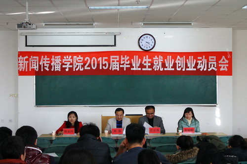 在校本部A区文科楼342教室召开了2015届毕业生就业创业动员会。会上,首先由辅导员雷丽霞就2015届毕业生就业前准备工作做了简要介绍。随后,副院长宫京成从就业心态入手,告诫各位毕业生要认清就业环境,立足高远,抓住机遇,有的放矢,并要求毕业生要切实增强求职技能,积累求职资本。同时,对毕业生的实习工作进行了详细部署,以往届毕业生实习过程中出现的问题为例,提醒毕业生们注意实习过程中的安全、社会及行业规范等礼节问题,并针对毕业实习部署工作中存在的问题进行了答疑。最后,学院党总支书记、常务副院长周强为2015届毕业生就业工作做动员讲话。他强调毕业生们要系统学习就业基本常识,鼓励大家坦然面对就业,时刻为就业创业工作做准备,既要把握大局也要留心细节,要强化团队合作意识,虚心向周围人学习,并预祝毕业生们在新的一年里能找到自己满意的工作。2015届全体毕业生参加了本次会议。