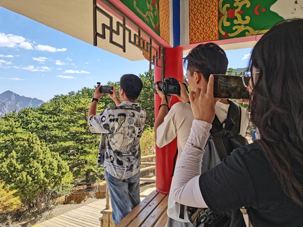实训小队第一站来到了贺兰山苏峪口国家森林公园,团队在景区工作人员的带领下,经过银巴古驿进行素材拍摄后由索道进入到森林公园的核心观景区青松岭。在青松岭,老师对实训小队的作品拍摄方向进行了指导培训,并对新媒体作品产出做了严格要求,小队成员在互相配合中,运用单反相机、灵眸及手机等设备进行了多手法、多角度的采拍录,顺利完成素材收集任务,为作品产出打好了基础。