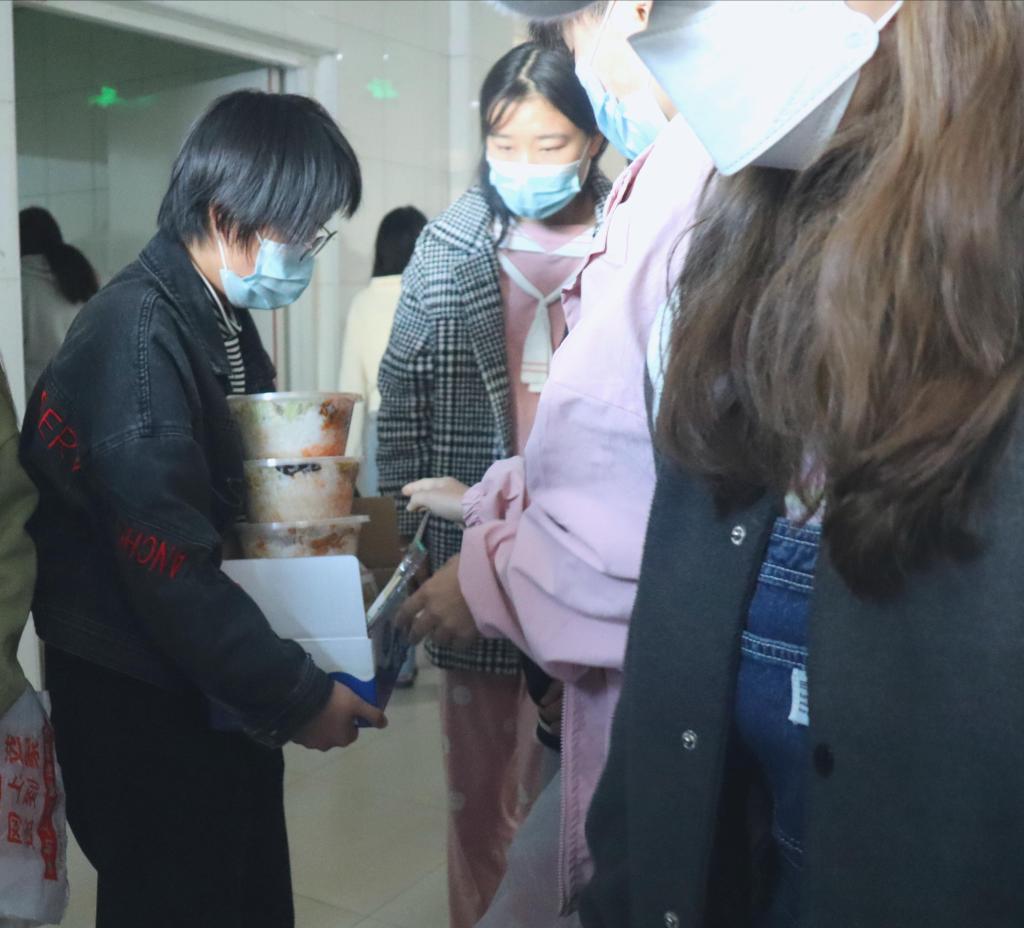 兰山公寓一号楼被封控后,楼外的同学们热情地帮助大家运送三餐,同时也提供购买生活必需品和物资、代取快递等服务,为大家的生活保驾护航,让大家安心地在宿舍生活学习。