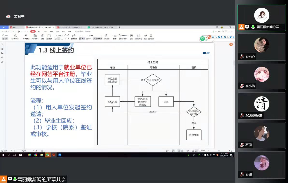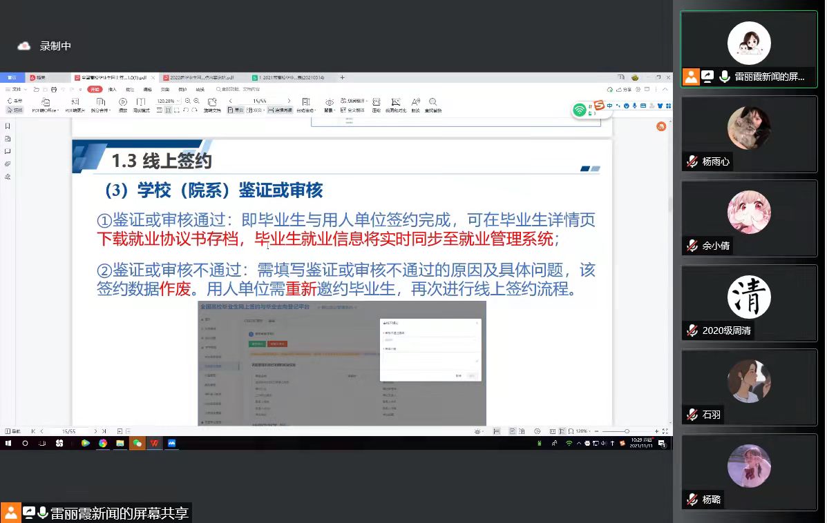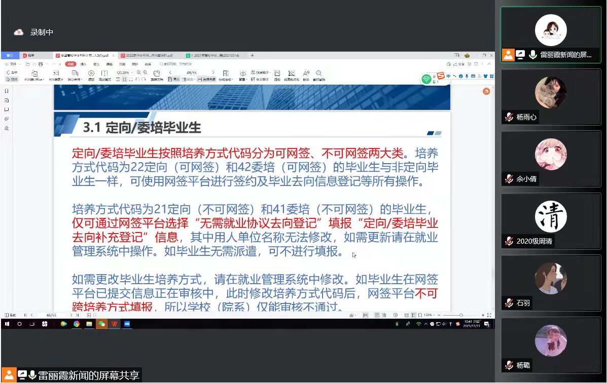 召开“全国高校毕业生网上签约与毕业去向登记平台使用培训”线上指导主题讲座,学生办公室主任雷丽霞主讲,2020级届全体毕业生在线聆听。