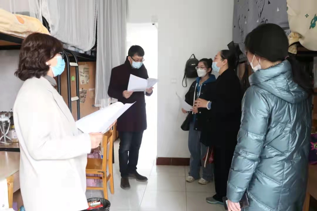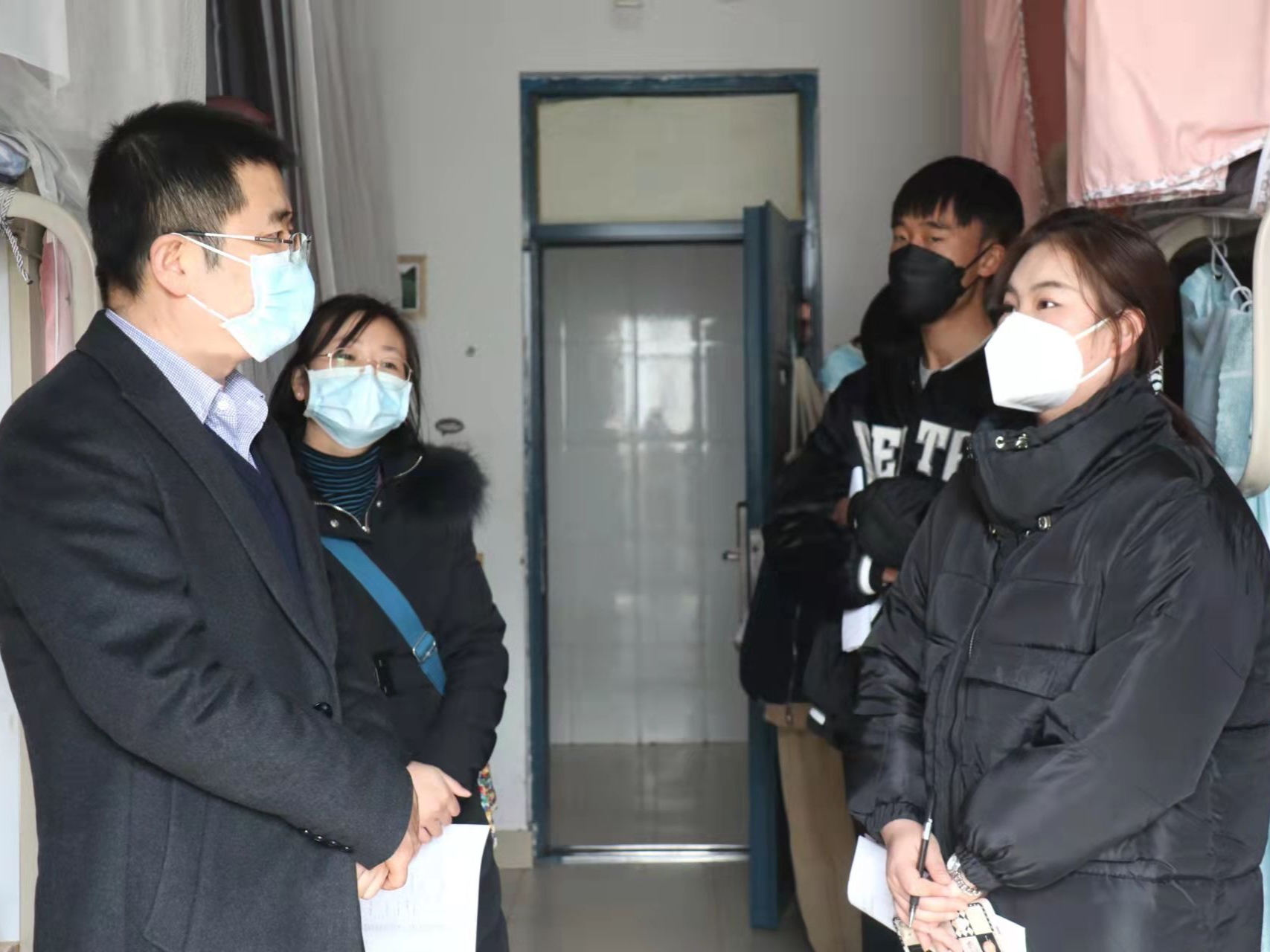 学院党总支书记潘瑞、党总支副书记李晓珉、副院长于鹏亮、研究生办公室秘书高燕前往怀远校区看望返校的研究生同学,并与大家进行了亲切交流,潘瑞表示:“疫情期间,大家要注意防护,保持宿舍卫生,勤通风,筑牢疫情防控常态化安全线。同时还要及时制定自己的学习和生活目标,快速调整心态,以饱满的精神状态迎接新学期的到来。”