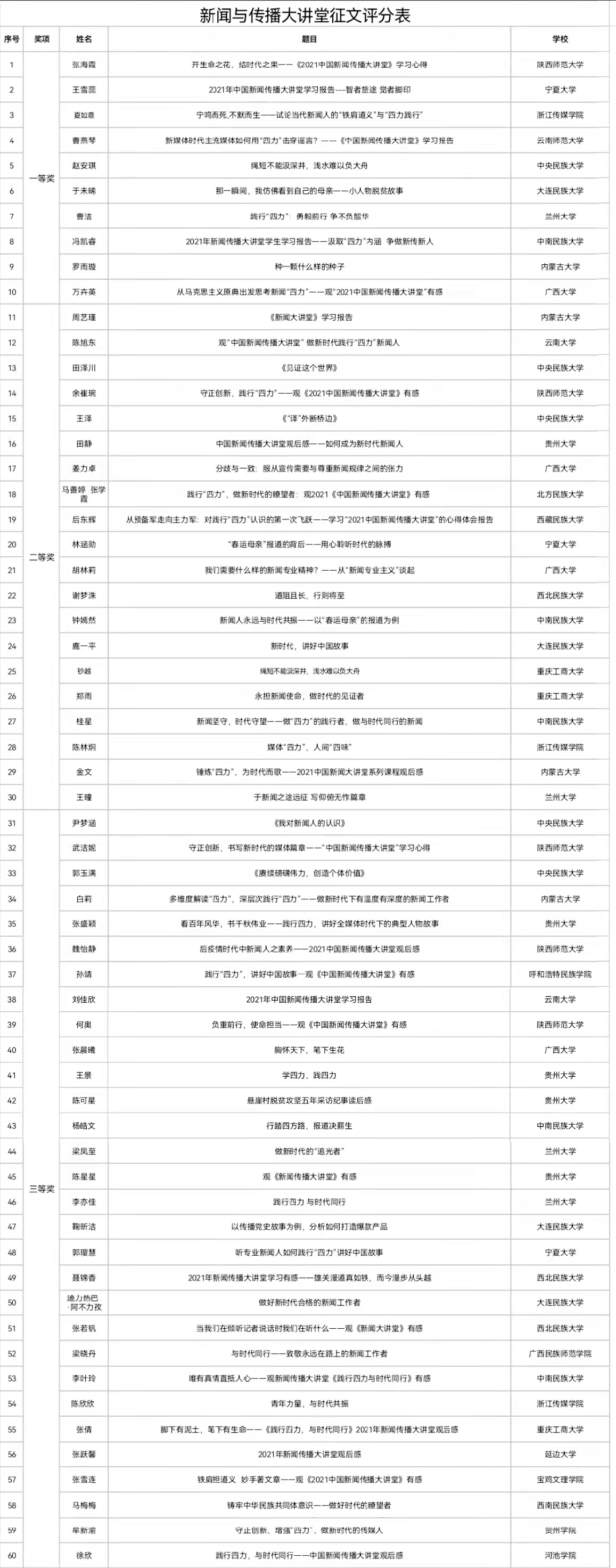 学子在西部地区、民族地区高校“共上一堂马新观课”暨2021年“新闻传播大讲堂”学习报告评比交流活动中斩获佳绩,其作品分别获得一等奖与二等奖、三等奖各一项。