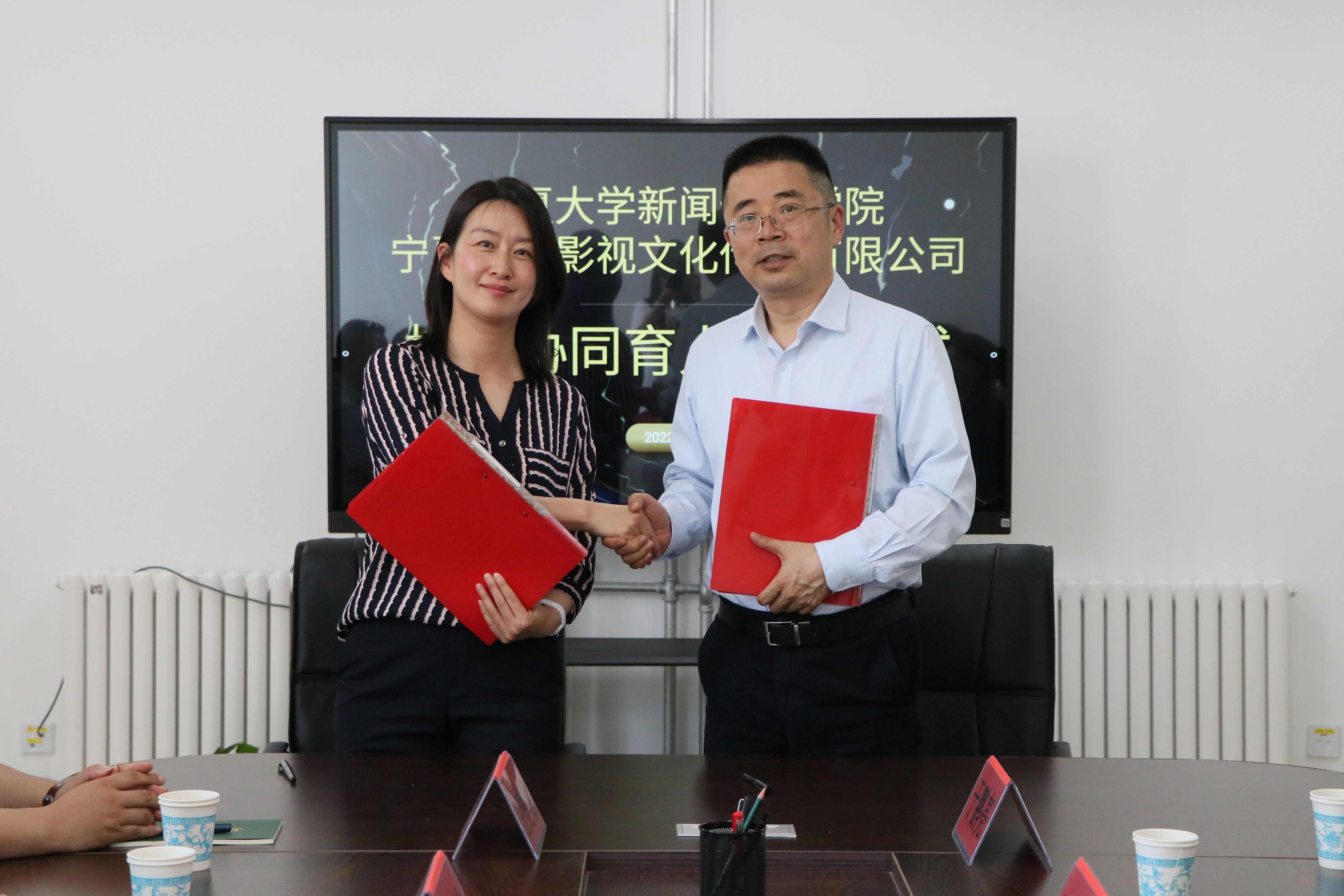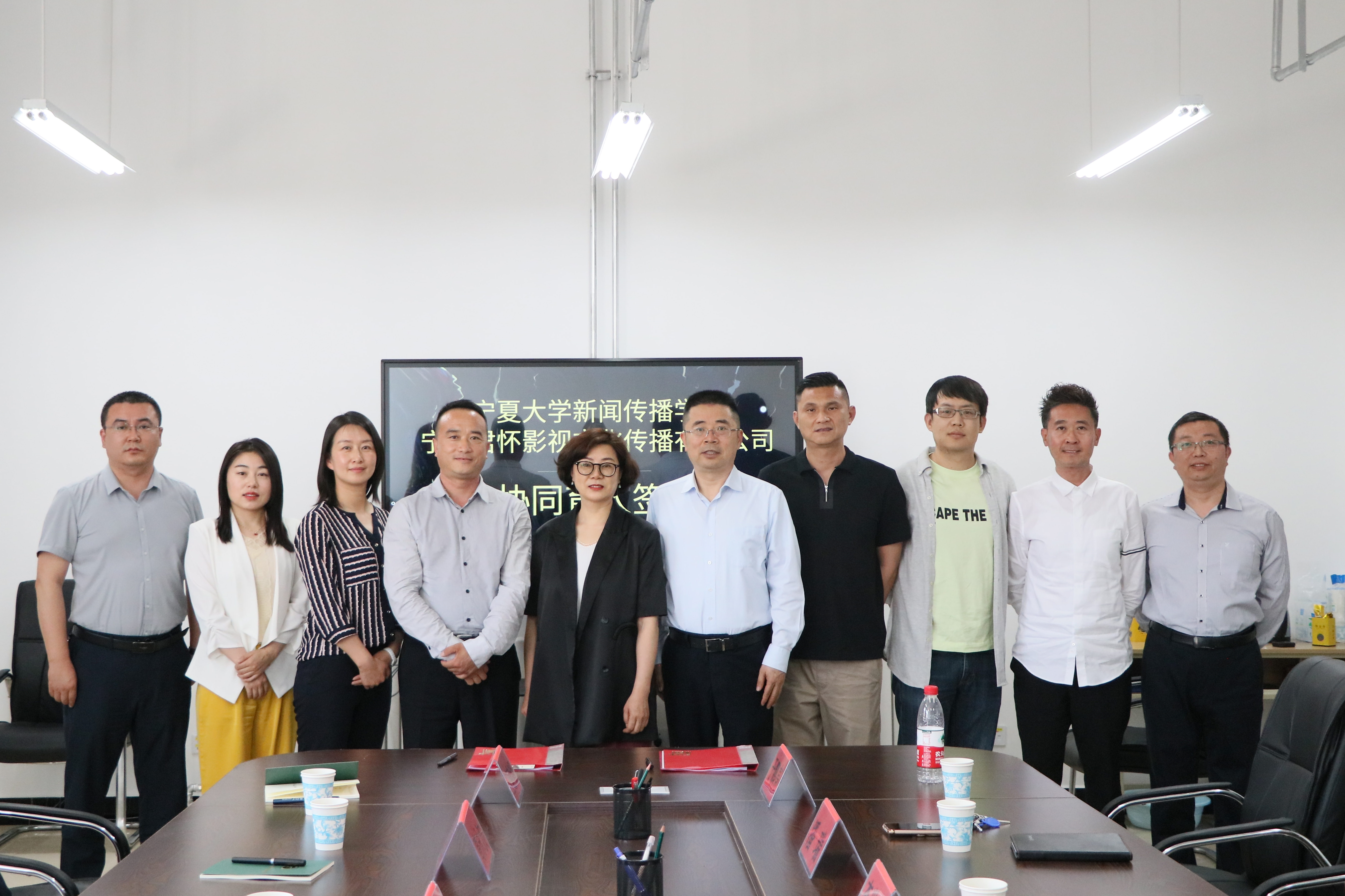 与宁夏君怀影视文化传播有限公司校企协同育人签约仪式在新闻大楼318会议室举行。宁夏君怀影视文化传播有限公司法定代表人高永波、宁夏君怀影视文化传播有限公司法律顾问樊蓉、学院党总支书记潘瑞、执行院长李世举、副院长张静涛、于鹏亮、广告系主任朱俊松出席仪式。