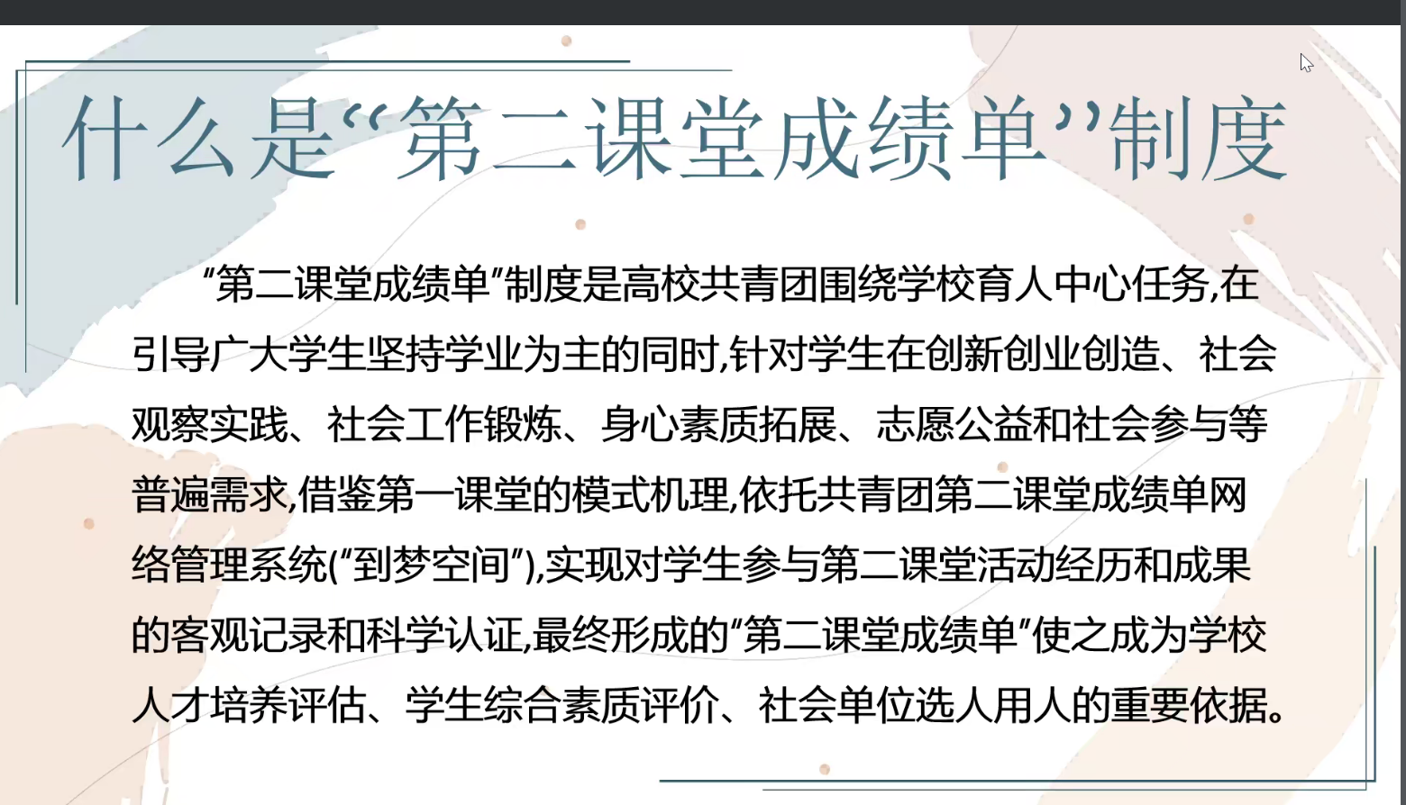 开展第二课堂制度新生线上培训会,第二课堂兼社团管理部门工作人员王艺瑾担任宣讲人,学生办公室主任雷丽霞及2022级全体新生应邀参会。