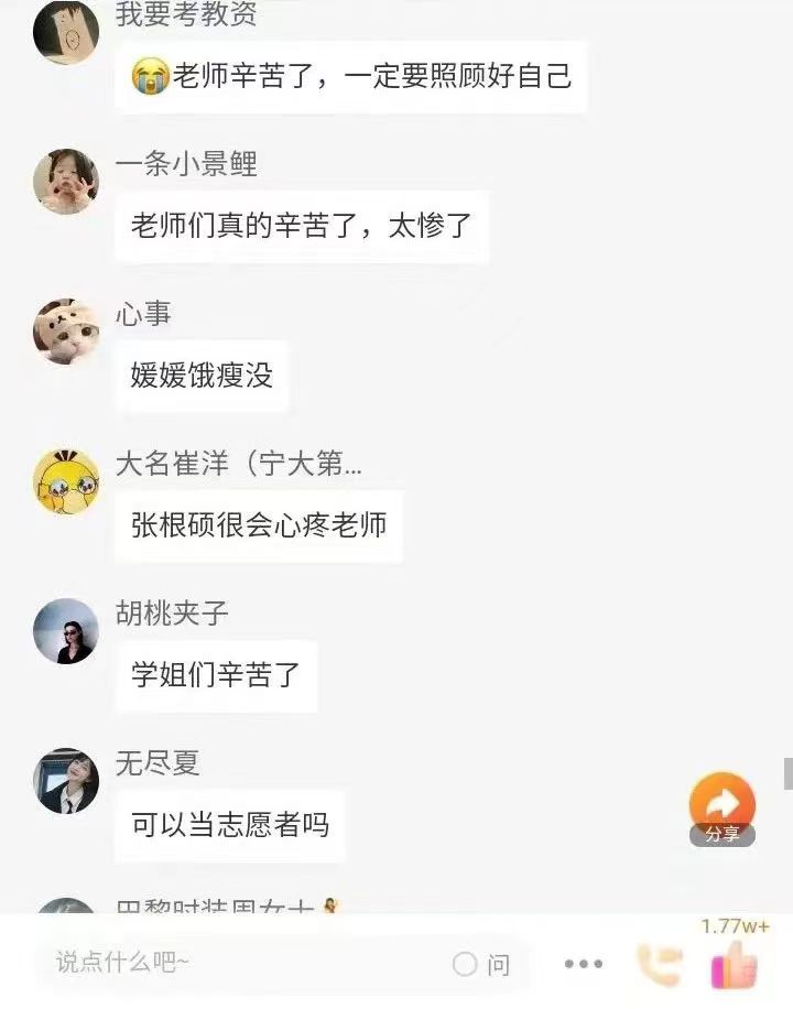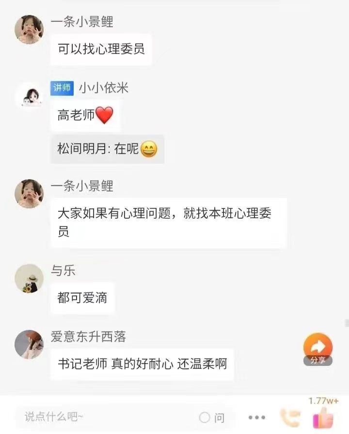 针对疫情封控的现状,潘瑞、雷丽霞以同学们封控期间的心理状态为出发点进行疏导,内容涉及饮食、体育运动、情绪宣泄等方面,为大家提供了建设性的建议。同学们敞开心扉,与老师们交流自己的想法,两位老师积极互动,解答同学们的各种问题,为同学们打上了一剂“强心针”。