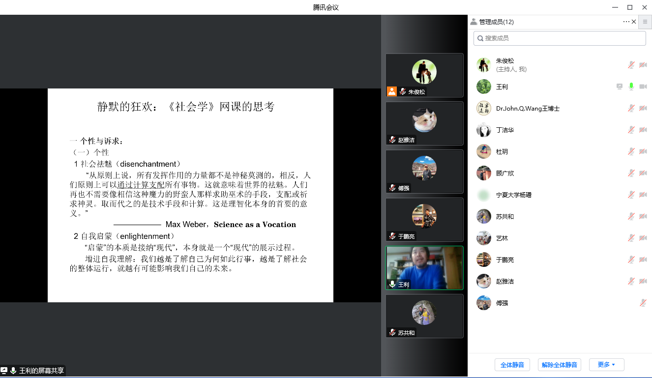 王利以“静默的狂欢”形容封控管理下,线上教学难以把控而产生的教师与学生的焦虑状态。面对线上教学的种种难点,基于社会学“去魅”和“启蒙”两大特质,王利认为教学的诉求在于引导学生发现自我、培养能力,并对诉求的实践经验进行了细致阐述。他提出,在教学过程中,教师首先需要提高对语言的敏感性,通过语言来把握课堂节奏、改善课堂效果;其次教师要为学生带来现场感;最后通过“老师—学生”“学生—老师”“学生—学生”三种互动方式提升学生的课堂参与感。