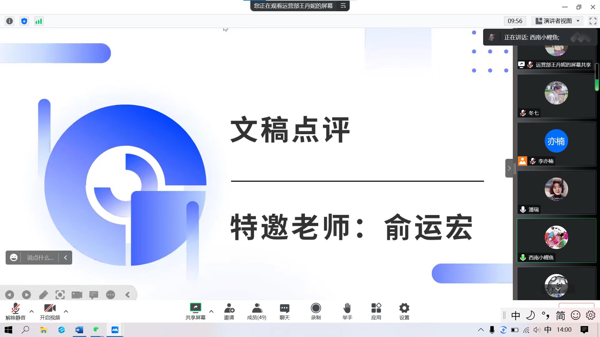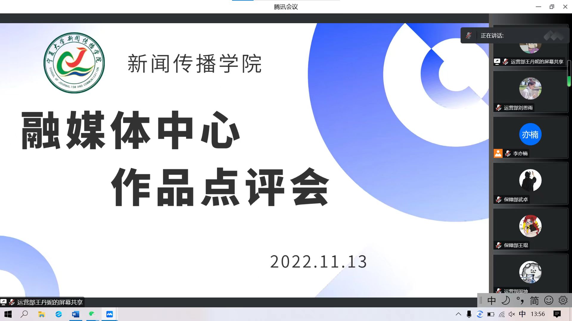 于11月13日下午,在线上召开融媒体中心第一次新闻作品点评会。院党总支书记潘瑞、副院长于鹏亮应邀参会,指导教师俞运宏、雷双军主讲,融媒体中心52名学生记者参加了培训。