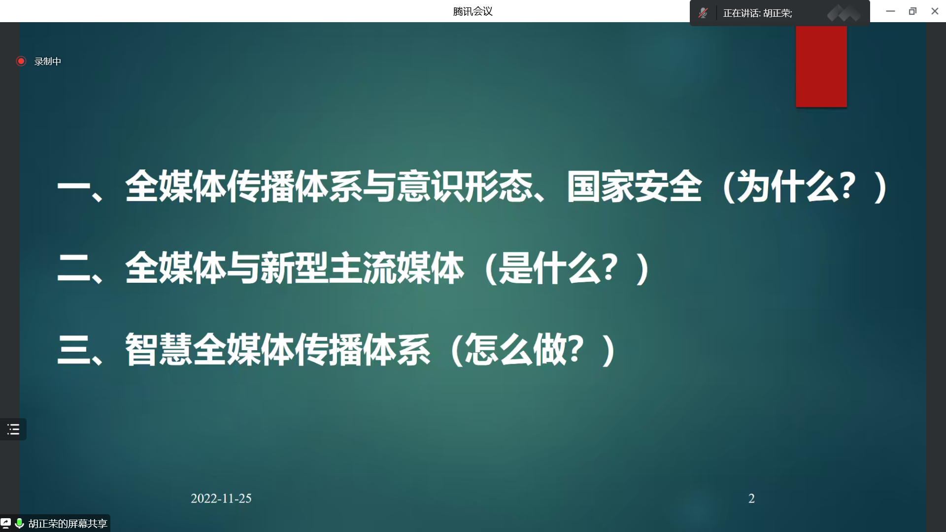 胡正荣教授首先从党的二十大报告中有关加强全媒体传播体系建设的重要论述出发,分析了新时代全媒体建设的内涵和实质,然后从“全媒体传播体系与意识形态、国家安全”、“全媒体与新型主流媒体”、“智慧全媒体传播”三个维度层层深入,进一步阐释了建设全媒体传播体系的重要意义。他指出,媒体安全是政治安全,也是社会安全,在互联网时代,社会竞争的核心资源是数据,要把中国的数据掌握在中国人手中,形成新安全发展格局。