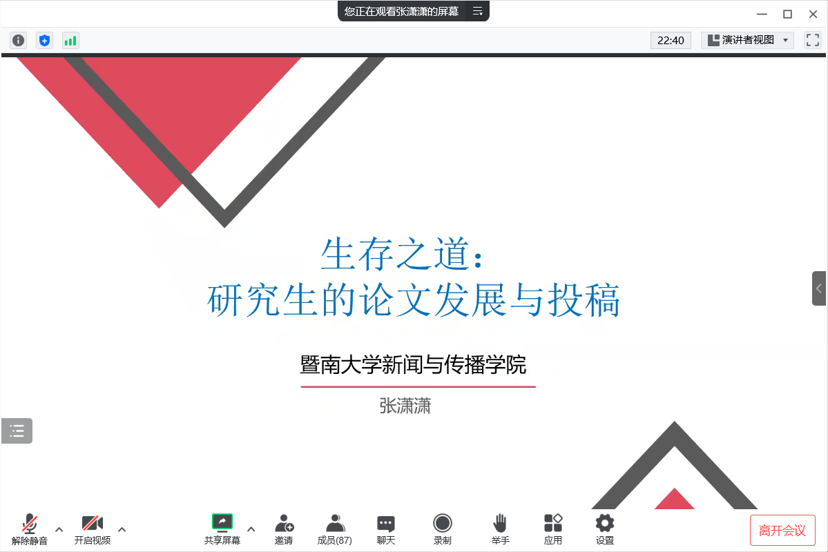 邀请暨南大学新闻与传播学院张潇潇教授开展《生存之道,研究生论文发展与投稿》线上前沿讲座,学院副院长张静涛教授主持讲座,新闻系全体研究生、部分本科生聆听了讲座。