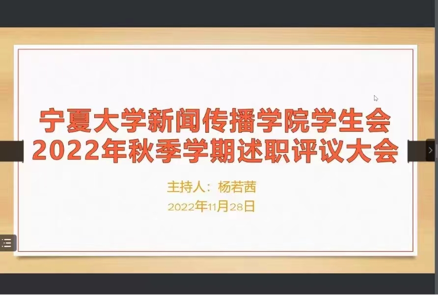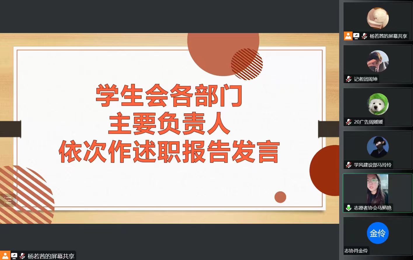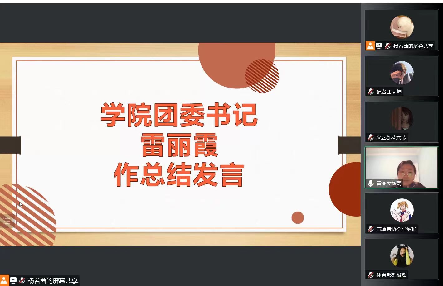 学生会于11月28日在线上组织开展学生会2022年秋季学期述职评议大会。学院党总支书记潘瑞、团委书记雷丽霞出席并指导本次评议工作,学生会全体成员参加会议。会议由学生会执行主席杨若茜主持。