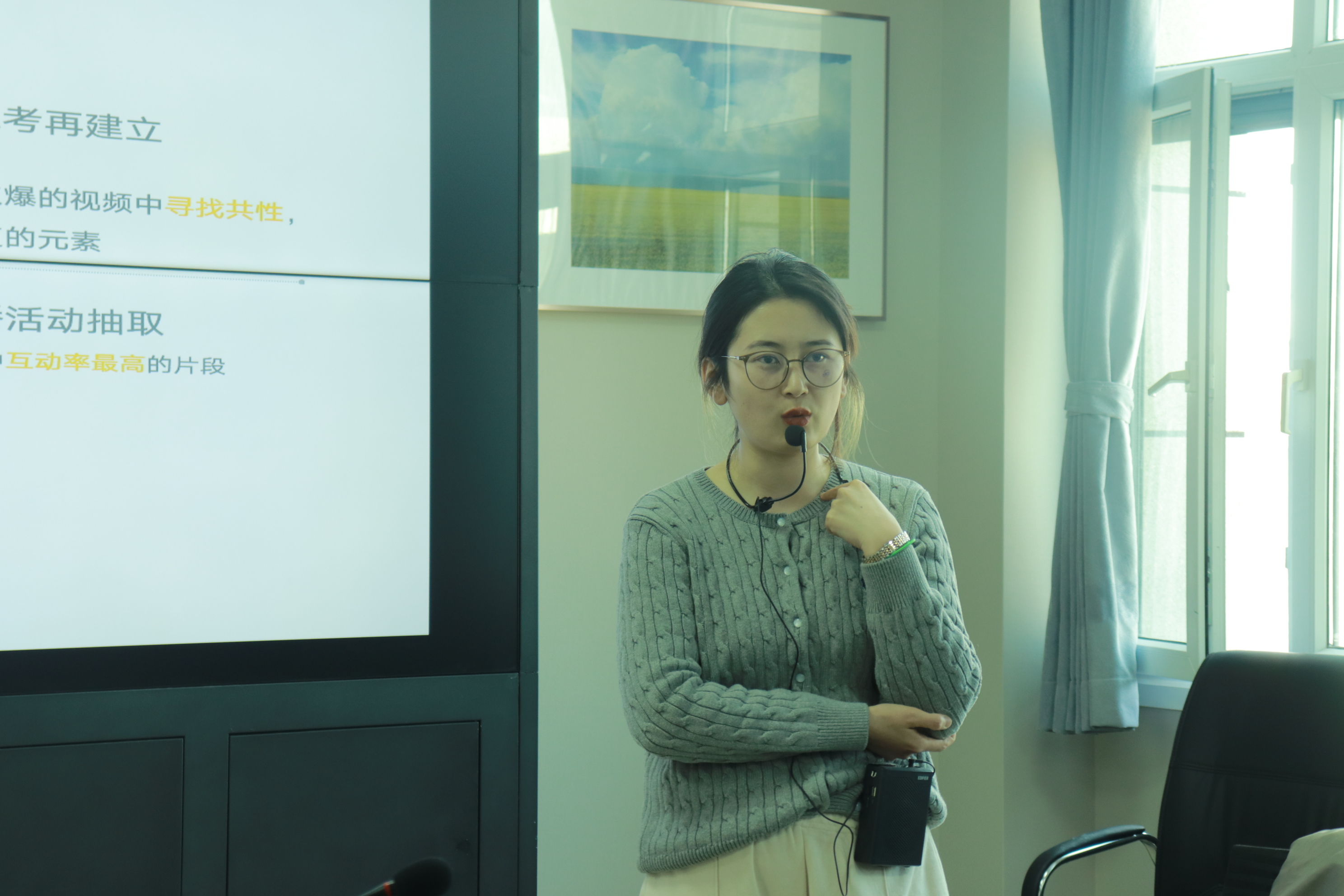 杨璠老师首先以中国外交部抖音官方账号为例,向大家介绍了有关短视频的概念以及内容特点。她说,学校媒体视频的时长要控制在五分钟之内,运用短纪录片等多种形式,提高推文的吸引力。随后,她指出了学生日常剪辑中所出现的常见问题,建议学生在前期准备中积极参考并模仿优秀的短视频剪辑手法,多积累剪辑经验,大胆尝试,避免空洞化,流水账式的叙事。