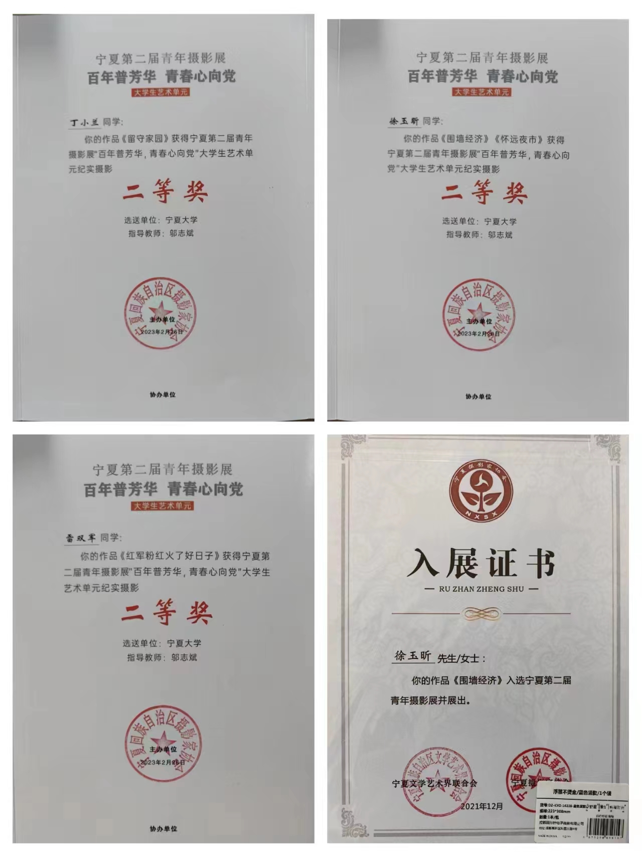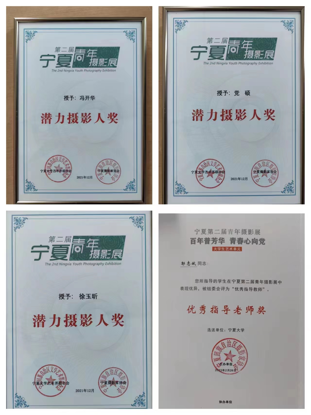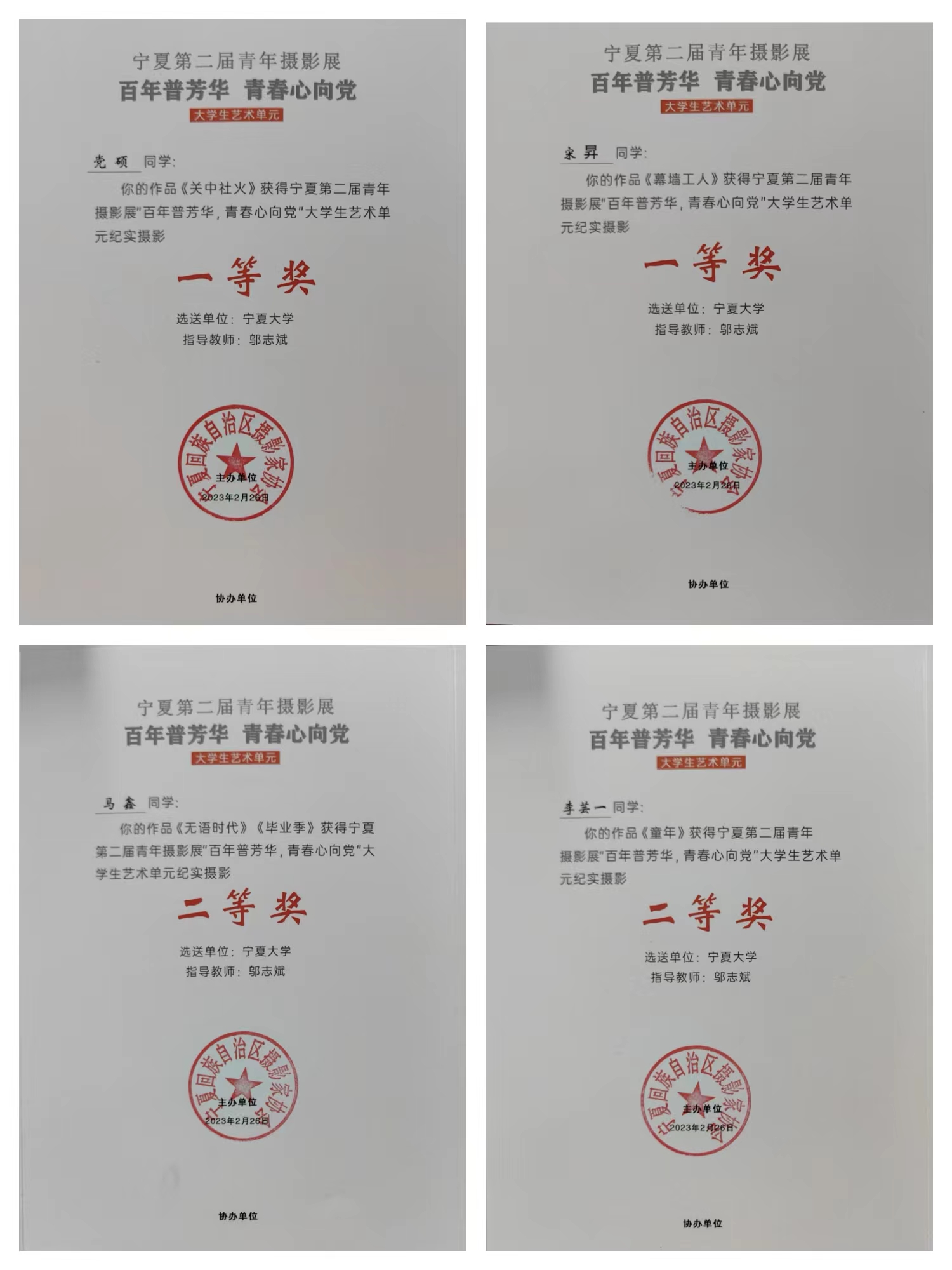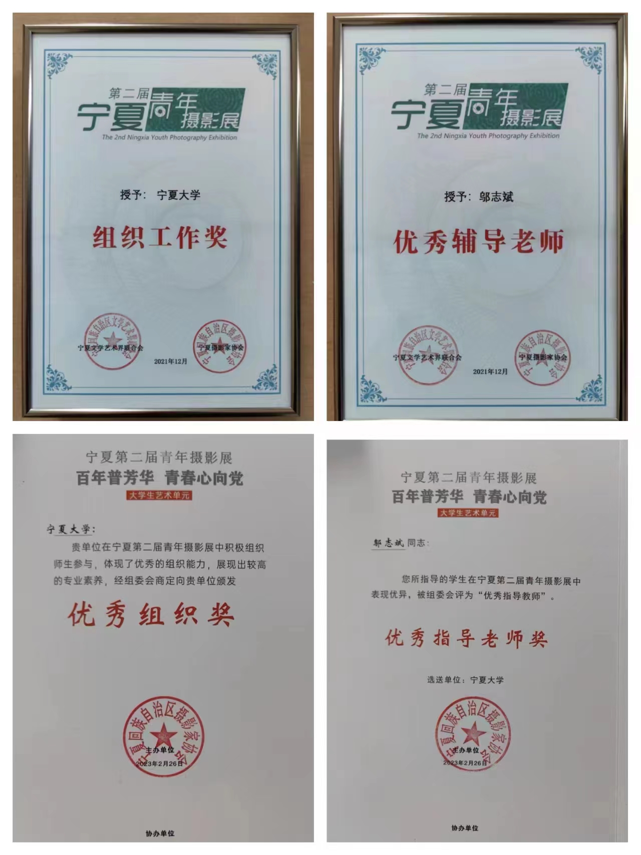 师生17人27组照片入展,9位师生分获一、二、三等奖,其中,一等奖两名,二等奖五名,三等奖两名;三位同学获潜力摄影人奖;邬志斌老师获优秀指导教师奖,自治区文联、区摄影协会授予电影先生