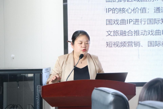 湖南师范大学的高欢欢以《中国戏曲的跨区域国别IP转化路径与策略研究》为题,讲述了在全球化背景下,如何通过IP转化实现戏曲艺术的国际传播与商业化开发。展示末尾,高欢欢老师即兴给大家唱了一段戏曲,赢得了在场热烈的掌声。