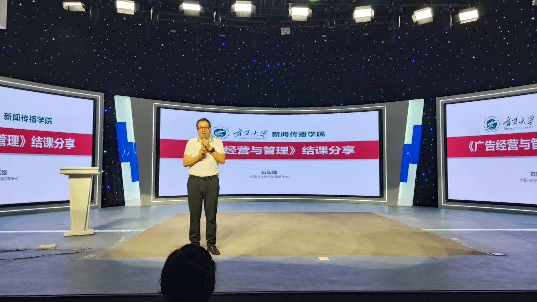 广告学系以市场需求为导向,特邀宁夏广告协会会长、宏强文化传媒集团董事长石宏强先生担任专业必修课程《广告经营与管理》的主讲导师,企业导师全程参与教学环节。他们将30年广告行业实战经验转化为教学内容。从“天龙十步企业模块”的模拟公司搭建,到智能算法优化、品牌策划方案的实战设计,学生直接对接广告传媒行业真实痛点。“用创意解决问题,用专业赢得市场”——石宏强老师在结业仪式上的寄语,成为贯穿课程的实践导向。“课程内容与行业标准的深度契合,是学院课程改革的重要突破。”电影先生