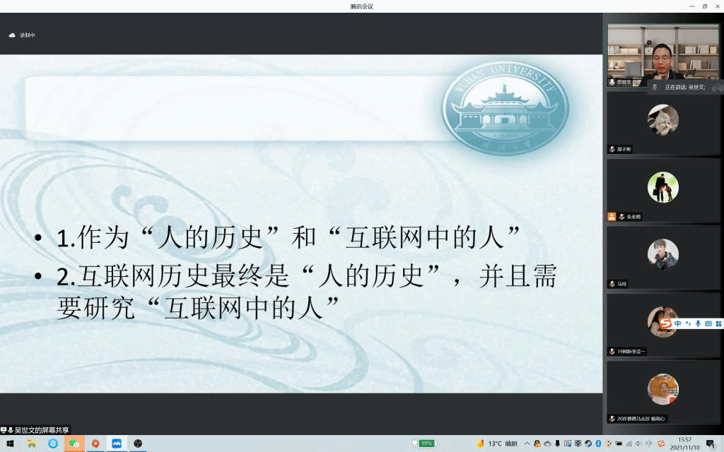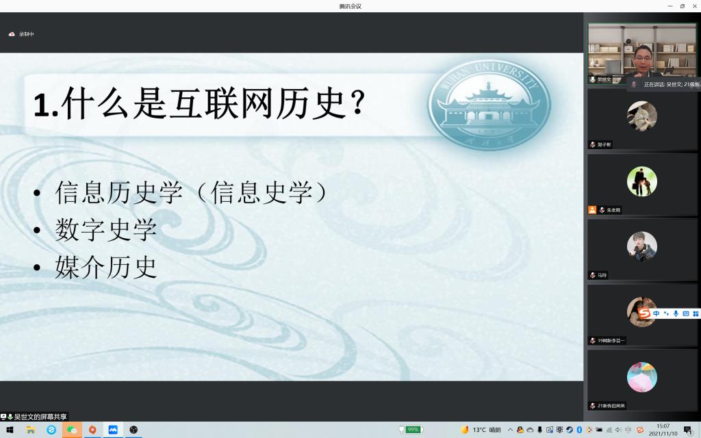 于11月10日下午在线上开展名为《互联网历史研究的理路和思路》的讲座。武汉大学新闻与传播学院副教授吴世文主讲,学院全体学生参加。