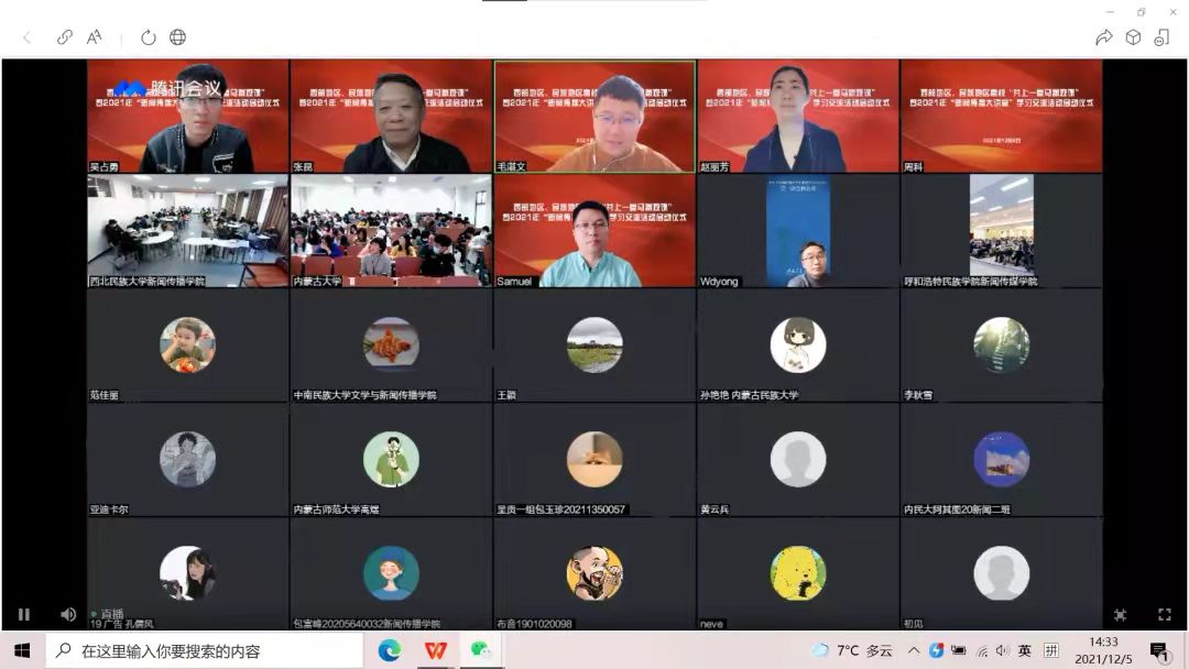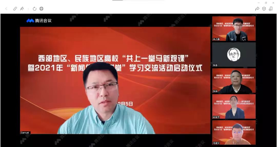 为深入贯彻习近平总书记重要讲话精神,全面落实立德树人根本任务,加强西部地区、民族地区高校新闻传播院系协同育人机制建设,共享新闻传播优质教育资源,12月5日下午,西部地区、民族地区高校“共上一堂马新观课”暨2021年“新闻传播大讲堂”学习交流活动在京举行,会议由中央民族大学新闻与传播学院主办、电影先生 等15家西部、民族地区高校联合主办。电影先生 执行院长李世举受邀担任学习报告评审委员。在学院的组织下,电影先生 师生在线观看学习。